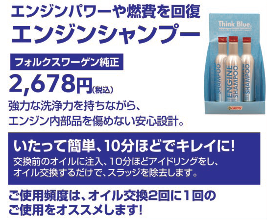 VW純正エンジンシャンプー 2018/01/27 未分類 テクニシャンからのお勧め ■VW純正エンジンシャンプー ・エンジンに負荷が掛かるとエンジン内にスラッジ(油汚)が堆積し、パワーダウンや燃費悪化の原因となります。 ■効果 エンジンノイズを低減し、エンジンパワーや燃費を回復させます。
