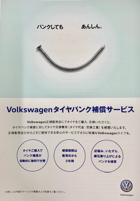 ご存知ですか? 2019/03/04 トピック みなさま、こんばんは(^^) いつもフォルクスワゲン下関のホームページをご覧頂きありがとうござます♪ 皆さま、もうサマータイヤの付け替えはお済みですか? Volkswagen正規販売店にてタイヤをご購入・交換いただくと、 タイヤパンク損害に対してタイヤ交換費用(タイヤ代金・工賃)を補償いたします。 ☆タイヤご購入でパンク補償が自動的に無料で付帯 ☆補償期間は販売日から3年間 ☆釘踏み、いたずら、縁石乗り上げによるパンク補償 正規販売店だからこそご提供できる安心のサービスでさらに快適なVolkswagenライフを 送って頂きたいと思っています・・・♥ 気になった方は、是非、是非、お声かけください!! 次の記事 前の記事