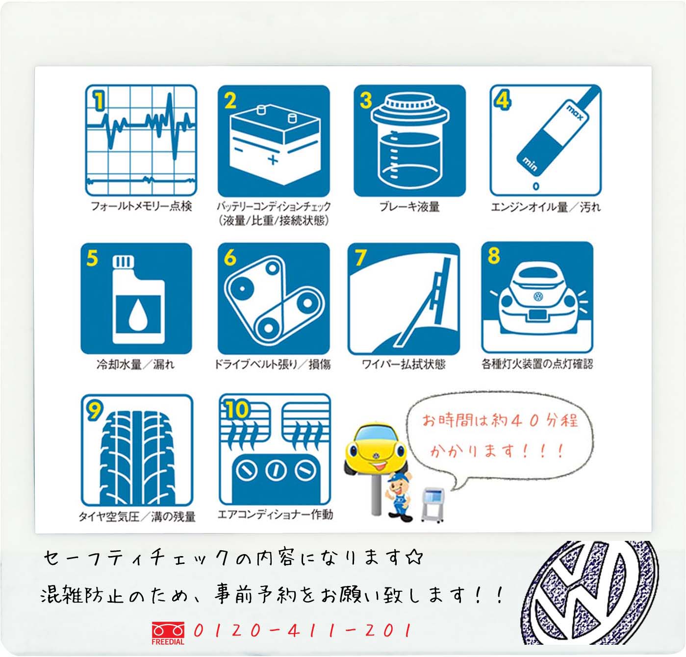 たくさんのオーナー様に大好評!!! 『Volkswagen下関オリジナル☆ご愛車セーフティチェック』 2012/03/26 トピック 少しずつ暖かくなり、春めいてきましたね。 『そろそろ、遠くへのドライブを楽しみたいな♪』と、 思っている方も、多いのではないでしょうか。 VW下関では、オーナーの皆様に、 『いつも安心してご愛車に乗っていただきたい!!!』 という、スタッフ一同の想いから始まった、 VW下関オリジナルのセーフティチェックを、 ワンコイン★500円★にて、 ご提供させていただいております。 お時間は約40分、チェック内容は10項目。 おかげさまで、法定点検だけではなく、 日々の定期点検として、 たくさんのオーナー様のご好評を いただいております!!! ★大事なご愛車のコンディションチェック★ 安心と共におでかけされませんか? どんな些細なことでも、 ご愛車のことで気になることがございましたら、 お気軽にVW下関までご相談くださいませ♪ 次の記事