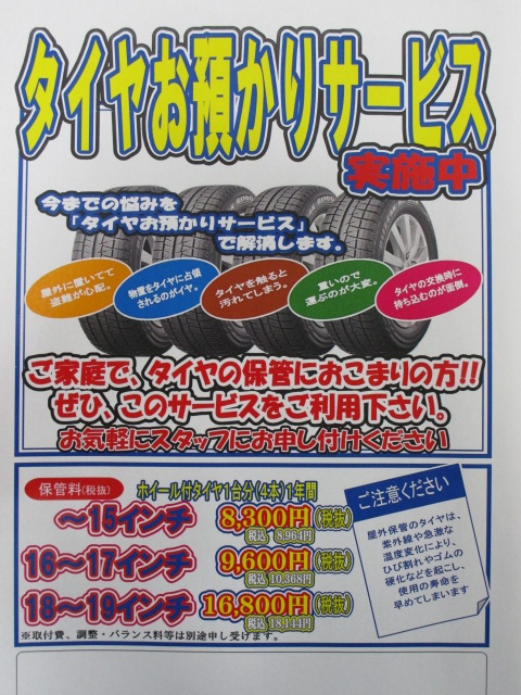 金額変更のお知らせ – タイヤお預かりサービス – 2015/02/07 トピック この度、弊社オリジナルサービス「タイヤお預かりサービス」の保管料が変更となりましたので、ご案内申し上げます。 ご家庭でタイヤ保管にお困りの方に、 「タイヤお預かりサービス」! ホイール付きタイヤ1台分(4本)1年間で、 〜 15インチ 6,300円 → 8,964円(税込) 16インチ 〜 17インチ 10,368円(税込) 18インチ 〜 19インチ 18,144円(税込) 詳しくは、店舗スタッフへお気軽にお問い合わせ願います。 次の記事 前の記事