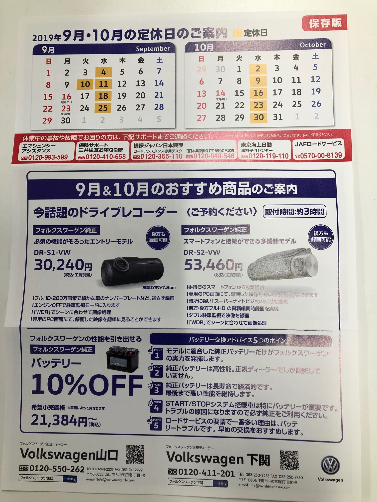 9月 店休日のお知らせ 2019/08/31 トピック いつもご覧いただきありがとうございます。 9月店休日のお知らせです。 毎週水曜日と10日(火)が 店休日となります。 また15日(日)、16日(月)は 海峡メッセにて 【インポートカーフェア 大商談会2019】 に出展いたします。 詳細はまたHPにてご紹介いたします。 次の記事 前の記事