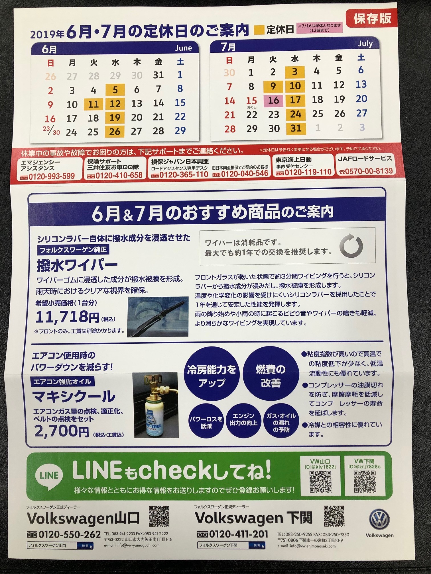 7月の店休日のご案内 2019/06/28 トピック いつもフォルクスワーゲン下関のホームページを ご覧いただき、ありがとうございます。 本日は、7月の店休日のご案内です。 7月は毎週水曜日と9日(火)が、 店休日となります。 また16日(火)は、社内研修の為、 正午までの営業となります。 よろしくお願いします。 次の記事 前の記事