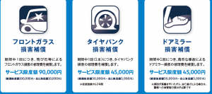 まず1つ目が、3種類のオリジナル補償を無償でプラスします。補償内容としましては、フロントガラス損害補償、タイヤパンク損害補償、ドアミラー損害補償の3種類です。例えば、飛び石でフロントガラスに傷が入った、釘を踏んでタイヤがパンクした、ドアミラーを擦ってしまったなどです。