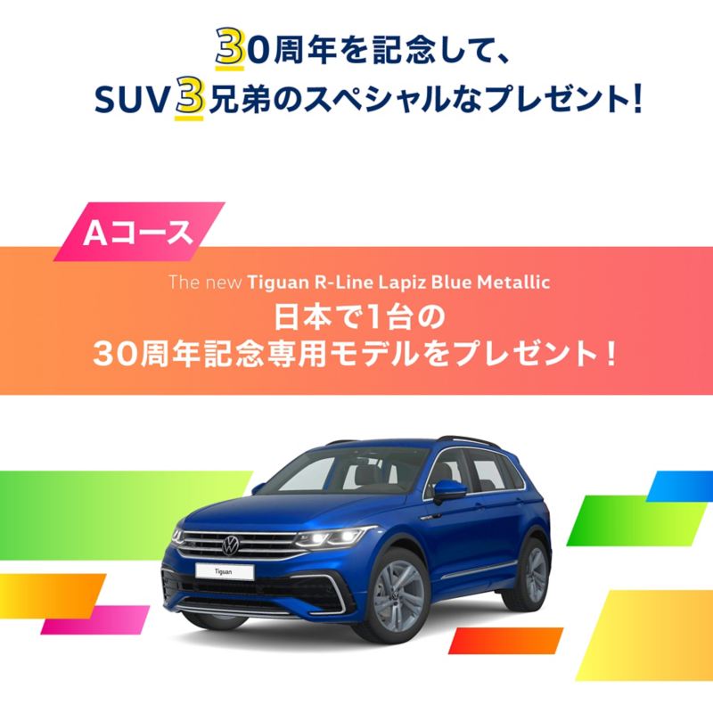 Aコースの内容は、The new Tiguan R-Line Lapiz Blue Metallic(ラピスブルーメタリック)を1名様にプレゼント。ハイスペックモデル「R」の専用色のラピスブルーを採用し、日本に1台の特別モデルです。