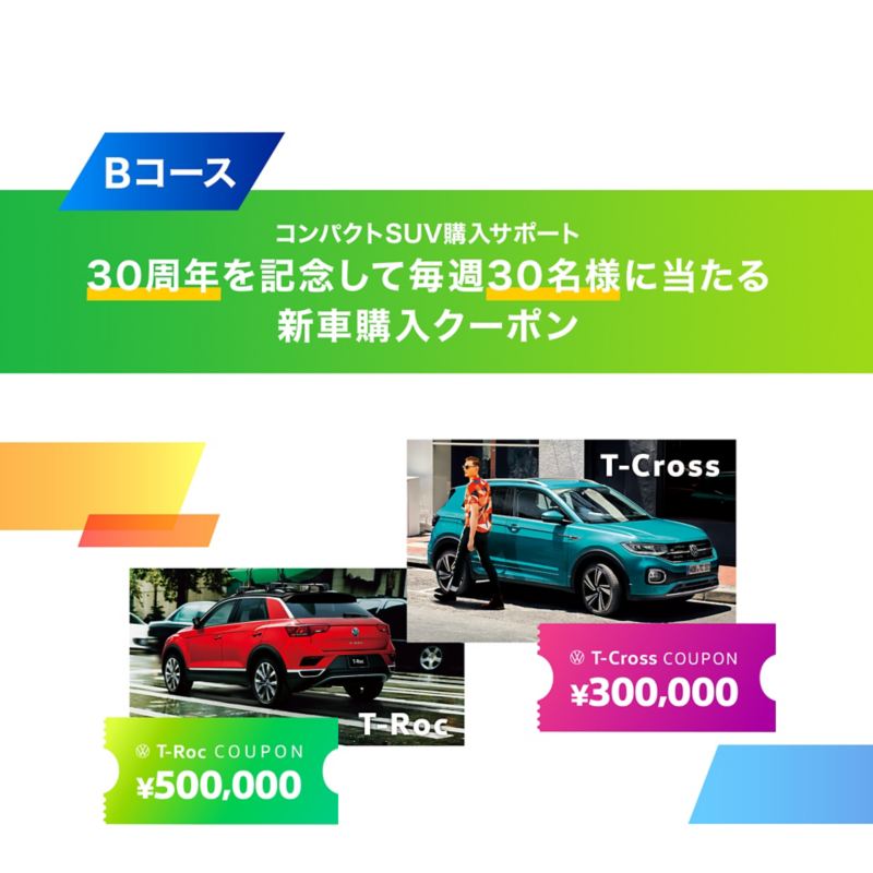 Bコースの内容は、T-Cross30万円/T-Roc50万円、人気の2モデルを対象としたコンパクトSUV購入サポートを毎週30名様にプレゼント! 合計150名様(毎週30名×全5回)