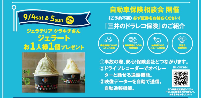 9月4日(土)~5日(日)の2日間は大人気の「ジュラテリア クラキチ」さんのジェラートをお一人様一個プレゼント! 同日自動車保険相談会も開催しますので、保険証券ご持参よろしくお願いいたします。緊急通報機能付きの保険会社のドラレコもご案内いたします。