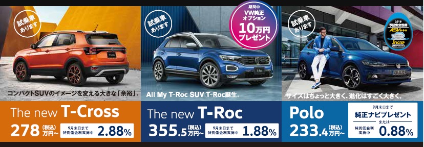 9月までの特別低金利中のPolo、T-Cross、T-Rocも展示車、試乗車ご準備しております。期間中はT-RocにVW純正オプション10万円分プレゼント!