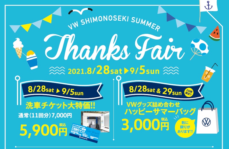 明日から感謝祭 2021/08/27 トピック いつもご覧いただきありがとうございます。明日8/28~9/5までお客様感謝祭になります。期間中、いろいろイベントを企画しております。本日のご紹介は、ハッピーサマーバッグ(¥3,000-)と洗車チケットの販売です。洗車チケットは通常¥7,000-ですが、期間中は¥5,900-でのご提供です。11回分が1包になっております。新型コロナウィルス感染対策をしっかりしたショールームでお待ちしております。密を避けるため、混雑時はご入店を制限する場合もございます。安心してご来店くださいませ。 次の記事 前の記事