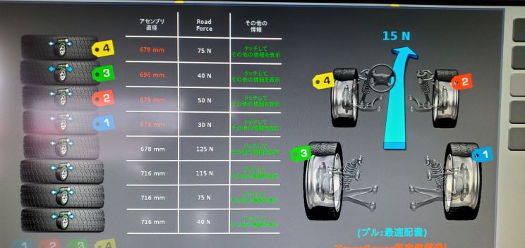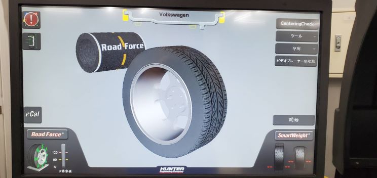 フォルクスワーゲン下関の『ホイールバランサー』は、タイヤ・ホイールの隠れた振動・横流れを解決する「ロード・フォース測定機能」を搭載。独自のロードローラーで、より走行時に近い状態を再現し、ラジアルフォース・ラテラルフォースを測定。タイヤの縦剛性、横流れの原因を自動的に診断・表示します。