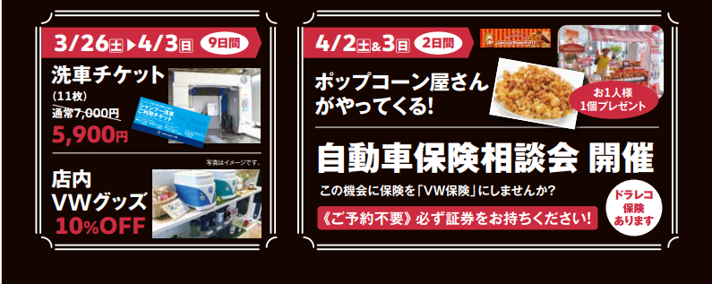 移転6周年フェア開催中♪ 2022/03/28 トピック いつもフォルクスワーゲン下関をご愛顧いただきありがとうございます。3/26(土)~4/3(日)まで移転6周年フェアを開催しております?? すぐにご納車出来るクルマ特集 現在半導体不足により各メーカーとも車の生産が遅れ、すぐにご納車出来る新車が少なくなっています。各1台限り、気になる方はお早めに??(詳しくはスタッフにお問い合わせください) VWグッズ&洗車チケットがお買い得 ただ今、店内VWグッズ10%OFFや洗車チケット11枚綴りを特別価格にて販売中です?早速たくさんの方に足を運んでいただいております?ご購入だけのご来店も大歓迎なので是非この機会にお越しください?また、4/2~3の2日間は保険相談会を開催いたします✨現在ご加入の保険証券をお持ちいただければお客様のニーズ合ったご提案をさせていただきます。そして、いつもご好評いただいております?ポップコーン屋さんもやってきます♪ご来店のお客様限定でお1人様1個プレゼントいたします? T-Cross、The new GOLF TDIや GTI の試乗車もご用意しております。お気軽に遊びにいらしてください!!皆様のご来店お待ちしております? 次の記事 前の記事